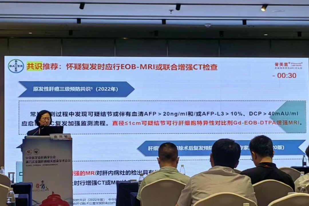 河北醫(yī)科大學(xué)第三醫(yī)院南月敏教授作“積極治療,從新出發(fā)-從新指南看慢乙肝初治患者的優(yōu)化治療策略”學(xué)術(shù)報(bào)告,在講到共識推薦:懷疑復(fù)發(fā)時應(yīng)行EOB-MRI或聯(lián)合增強(qiáng)CT檢查時,指出常規(guī)檢測過程中發(fā)現(xiàn)可疑結(jié)節(jié)或伴有血清AFP>20ng/ml和AFP-L3>10%、DCP>40mAU/ml,應(yīng)啟動HCC復(fù)發(fā)加強(qiáng)監(jiān)測流程。