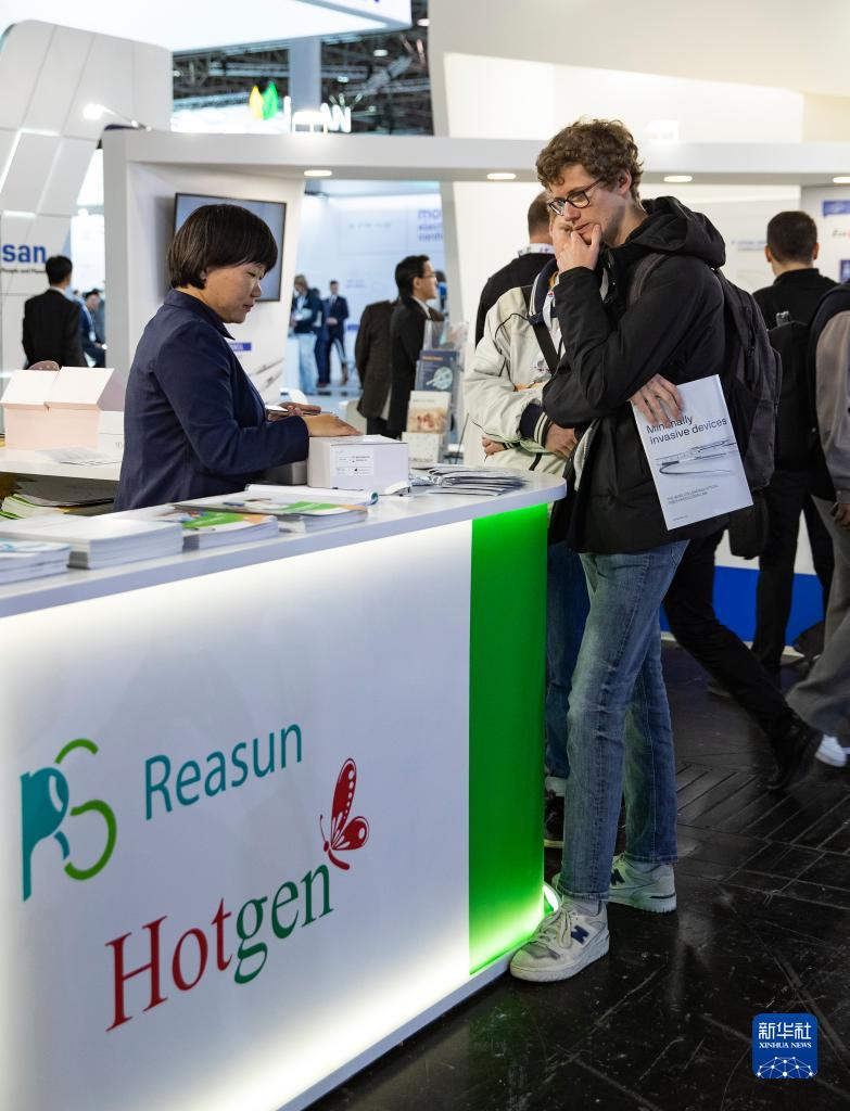 11月13日,在德國杜塞爾多夫國際醫(yī)療器械設(shè)備展,參觀者在熱景生物展位咨詢洽談。新華社記者 張帆 攝