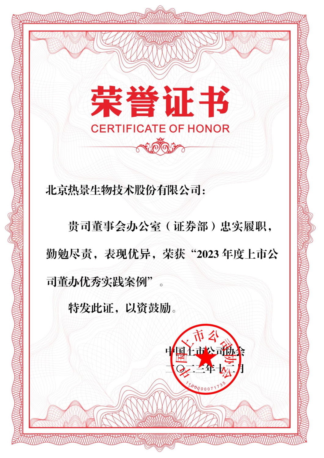 熱景生物獲評中上協(xié)“2023年度上市公司董辦優(yōu)秀實(shí)踐案例”