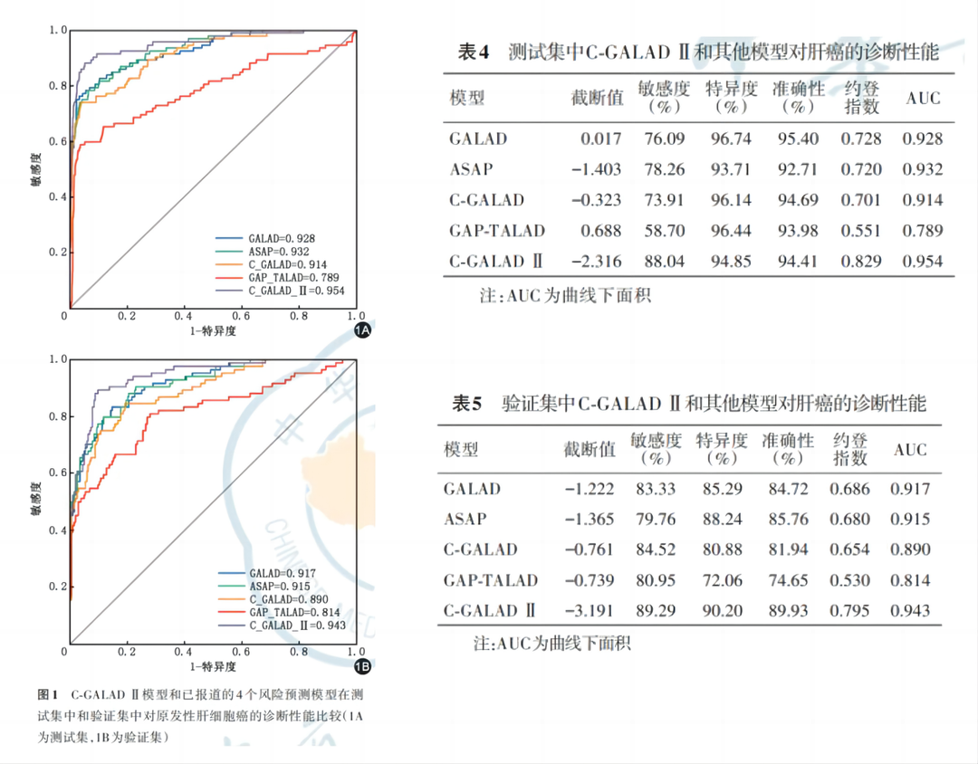 C-GALAD Ⅱ模型不僅保留了原有GALAD模型的優(yōu)勢,還納入了更多影響因素,提升了對中國人群的適應(yīng)性和診斷準確性。實證結(jié)果顯示,無論是內(nèi)部測試集還是外部獨立驗證集,C-GALAD Ⅱ模型的ROC曲線下面積(AUC)高達0.954和0.943,敏感度分別為88.04%和89.29%,特異性分別為94.85%和90.2%,這些性能參數(shù)均優(yōu)于其他已報道模型