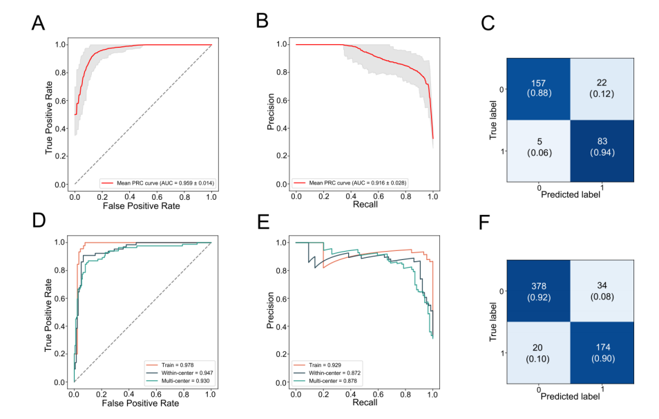 為進一步提高模型的診斷性能,我們將miRNA靶標(biāo)與AFP/DCP特征結(jié)合。結(jié)果顯示,結(jié)合后模型的ROC-AUC值提升至0.96,PRAUC值達(dá)到0.91(圖3A-B)。此外,基于該聯(lián)合特征的模型對194例HCC患者的總體靈敏度達(dá)到90.70%,顯著高于單獨使用miRNA靶標(biāo)時的88.06%(圖3C)。這表明miRNA與蛋白特征之間具有互補作用,顯著增強了HCC的診斷準(zhǔn)確性。