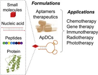 Aptamer是一段經(jīng)體外篩選得到的,折疊成特殊三維結(jié)構(gòu)的短單鏈寡核苷酸,能特異性結(jié)合較大范圍的目標,包括蛋白質(zhì)、小分子、金屬離子、病毒、細菌和全細胞,其高特異性和結(jié)合親和力可達到抗體水平。相比抗體藥物,核酸適配體具有體積小、較低免疫原性、無細胞化學(xué)合成以及較強組織穿透力、易修飾成本低等優(yōu)點,在疾病診斷、治療和預(yù)防中有著廣泛的藥物應(yīng)用潛力。但其三維構(gòu)象受pH影響較大,親和性高度依賴于溶液性質(zhì)。第一款 Aptamer 藥物Pegaptanib于2004 年獲FDA批準。它是一種具有29個核苷酸的RNA適配體,5’端的聚乙二醇部分可延長其在人體內(nèi)的停留時間。Pegaptanib 通過空間結(jié)構(gòu)與血管內(nèi)皮生長因子(VEGF)結(jié)合,抑制血管生成達到治療效果,因此被開發(fā)用于治療濕性年齡相關(guān)性黃斑變性。