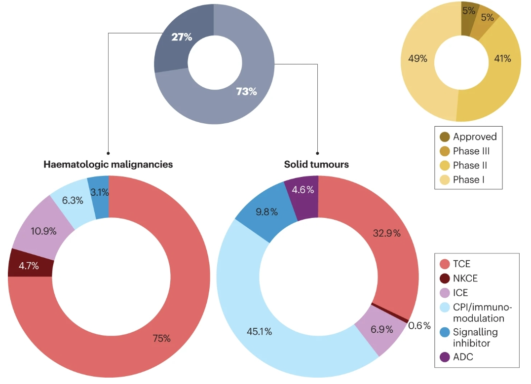 目前,有300多項臨床試驗涉及200多種不同的雙特異性抗體分子,其中約75%用于治療實體瘤,25%用于治療血液系統(tǒng)惡性腫瘤。有10種bsAb藥物已被批準用于癌癥治療,其中9種在美國和/或歐洲獲得批準,cadonilimab在中國獲得批準。到目前為止,臨床中開發(fā)的很大一部分bsAbs已經(jīng)處于后期階段(II期和III期)。另外,可以發(fā)現(xiàn),治療實體瘤的bsAbs主要由免疫調(diào)節(jié)劑主導,包括雙CPI(約45%)和TCE(約33%),其次是靶向雙途徑、ICEs和ADC的bsAb。