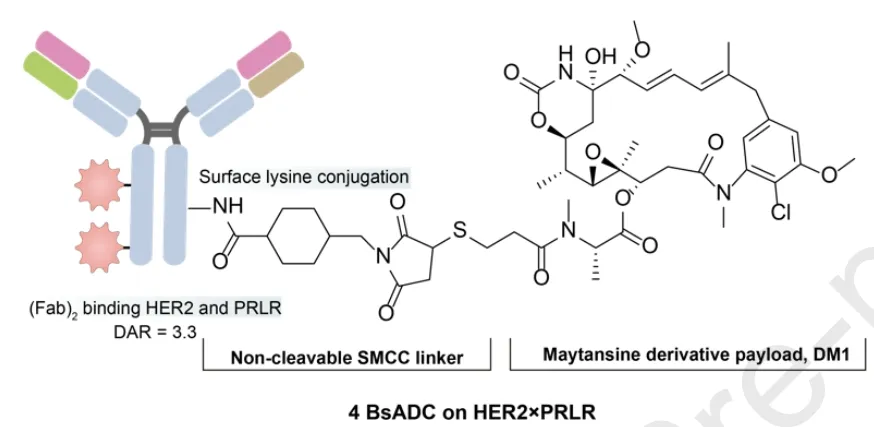 采用"Knobs-into-Holes"(KIH)技術(shù),設(shè)計(jì)了一種含有HER2特異臂和PRLR特異臂的雙特異性抗體(Bispecific Antibody, BsAb)。這種BsADC通過(guò)在其表面賴氨酸上引入不可裂解的連接子(如N-succinimidyl 4-(maleimidomethyl)cyclohexane-1-carboxylate, SMCC),將DM1(一種抗有絲分裂藥物)與抗體連接起來(lái),形成平均藥物抗體比率(DAR)為3.324的BsADC。研究表明,即使PRLR在細(xì)胞表面的表達(dá)水平低于HER2,也足以引發(fā)持續(xù)的內(nèi)化作用和隨后的溶酶體降解過(guò)程。這表明高周轉(zhuǎn)率的表面靶標(biāo),即便表達(dá)水平不高,也能有效地促進(jìn)內(nèi)化和溶酶體降解,從而可能提高BsADCs的療效。