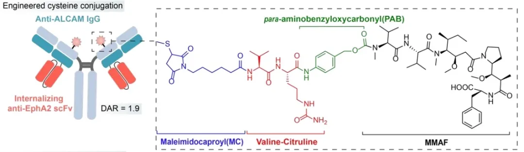 MC-VC-pab-MMAF這一有效載荷復(fù)合物通過(guò)半胱氨酸殘基的位點(diǎn)特異性偶聯(lián)技術(shù)實(shí)現(xiàn)。在BsADCs的雙重特異性結(jié)合作用下,內(nèi)化效果可能會(huì)因同時(shí)靶向的相鄰抗原而顯著變化,這與它們的表達(dá)比例密切相關(guān)。這種特性擴(kuò)展了抗原選擇的廣度,使得原本內(nèi)化能力較弱的BsADCs設(shè)計(jì)成為可能。這種創(chuàng)新的方法為增強(qiáng)某些抗原的內(nèi)化能力提供了一種精細(xì)的策略,增強(qiáng)了BsADCs對(duì)更廣泛腫瘤抗原的多功能性和有效性。