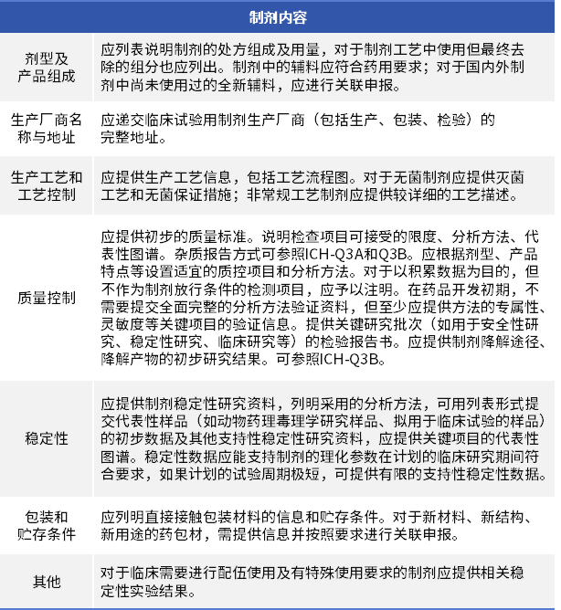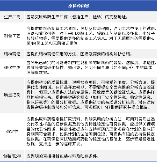 由于小核酸藥物的制備,通常使用固相合成技術(shù),故工藝開發(fā)、工藝放大和質(zhì)量控制上存在一定的壁壘,對技術(shù)、設(shè)備、環(huán)境有較高的要求,伴隨著的也是高成本,國內(nèi)對于這方面的硬件條件配套,還有很大的發(fā)展空間。早期的注冊申報,如果按照《新藥I期臨床試驗申請技術(shù)指南》進行工作開展,原料藥和制劑需要按照以下內(nèi)容進行。