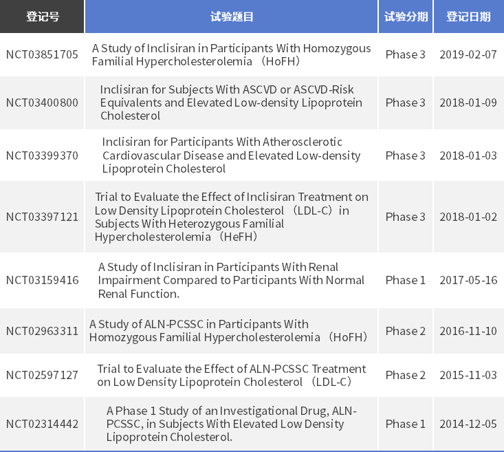 大部分小核酸藥物的臨床開發(fā),大都經(jīng)歷在10年以上,且真正意義上完成的臨床試驗數(shù)量,相對于當先傳統(tǒng)的藥物開發(fā),數(shù)量不是很多。以leqvio已完成的臨床試驗舉例,具體如下。