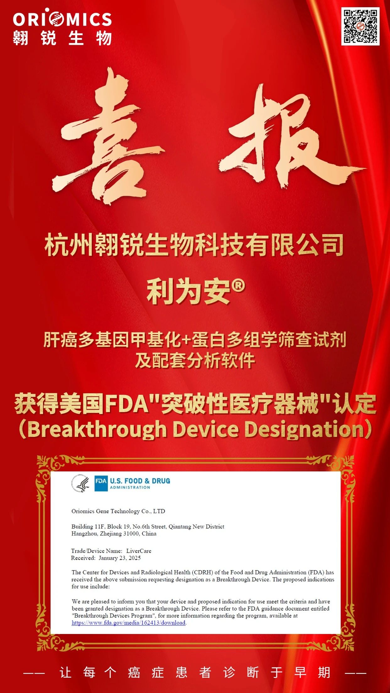 2025年3月21日,熱景生物參股企業(yè)翱銳生物旗下早篩產(chǎn)品利為安?——肝癌多基因甲基化+蛋白多組學(xué)篩查試劑及配套分析軟件獲得美國食品藥品管理局(FDA)“突破性醫(yī)療器械”(Breakthrough Device Designation)認(rèn)定。
