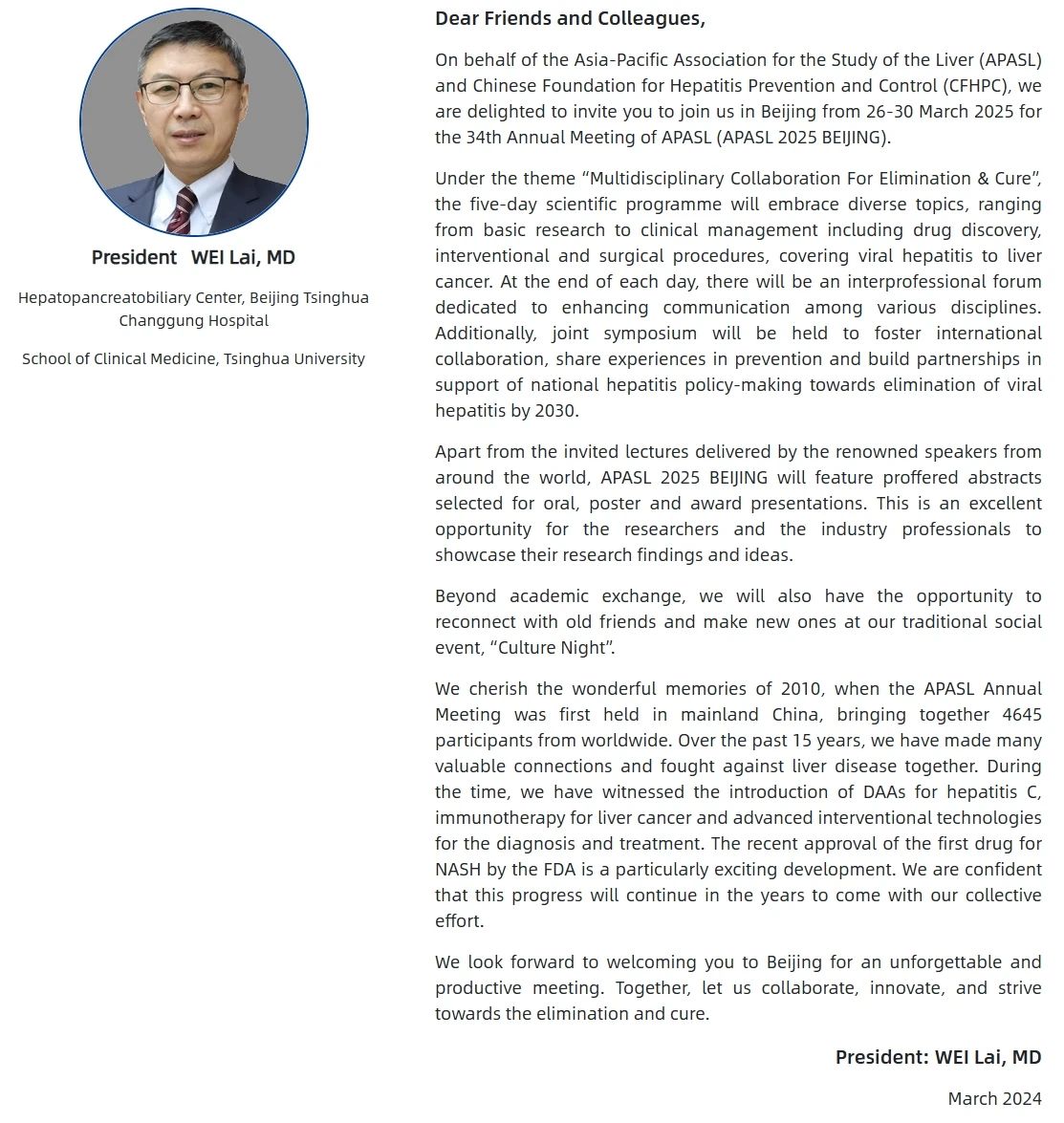 第34屆亞太肝病學(xué)會(huì)年會(huì)(APASL 2025)將于2025年3月26-30日在北京國(guó)家會(huì)議中心隆重舉行。大會(huì)以"多學(xué)科協(xié)作:肝病消除與治愈"(Multidisciplinary Collaboration For Elimination & Cure)為主題,由清華大學(xué)附屬北京清華長(zhǎng)庚醫(yī)院魏來教授擔(dān)任主席,將匯聚全球肝病學(xué)頂尖專家,共同構(gòu)建跨學(xué)科協(xié)作的創(chuàng)新范式。