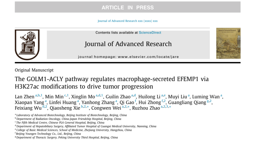 近日,熱景生物參股公司北京堯景基因技術(shù)有限公司(簡(jiǎn)稱“堯景基因”)聯(lián)合北京生物技術(shù)研究所、中日友好醫(yī)院、廣西醫(yī)科大學(xué)附屬腫瘤醫(yī)院等多家單位,在《Journal of Advanced Research》雜志發(fā)表重要研究成果,論文題為《The GOLM1-ACLY pathway regulates macrophage-secreted EFEMP1 via H3K27ac modifications to drive tumor progression》。該研究首次闡明巨噬細(xì)胞中 GOLM1-ACLY 軸通過表觀遺傳調(diào)控與細(xì)胞間信號(hào)傳導(dǎo)影響腫瘤進(jìn)展的分子機(jī)制,為癌癥治療提供了全新潛在靶點(diǎn)。