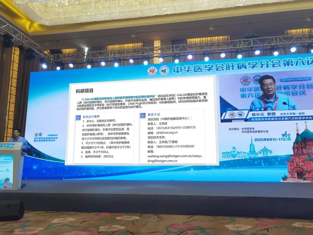 ? “揭榜掛帥”助力肝癌早篩研究:為加速肝癌早期預(yù)警技術(shù)的臨床轉(zhuǎn)化與精準(zhǔn)應(yīng)用,徐小元教授在會(huì)上重磅發(fā)布“C-GALAD模型預(yù)警肝癌風(fēng)險(xiǎn)”揭榜掛帥科研項(xiàng)目。該項(xiàng)目投入200萬(wàn)元科研經(jīng)費(fèi),面向全國(guó)招募具備肝癌高危隊(duì)列資源的醫(yī)院或研究機(jī)構(gòu),合作開展多中心、大樣本量(4000例)的回顧性研究。研究旨在深入評(píng)估C-GALAD模型(整合AFP、AFP-L3%、DCP及年齡、性別)在不同類型肝癌高危人群(如肝硬化、肝癌術(shù)后、肝衰竭等)中的早期預(yù)警效能及其亞組表現(xiàn)差異,研究將幫助臨床更早期地識(shí)別肝癌風(fēng)險(xiǎn),并為患者提供個(gè)性化的監(jiān)測(cè)與治療建議。