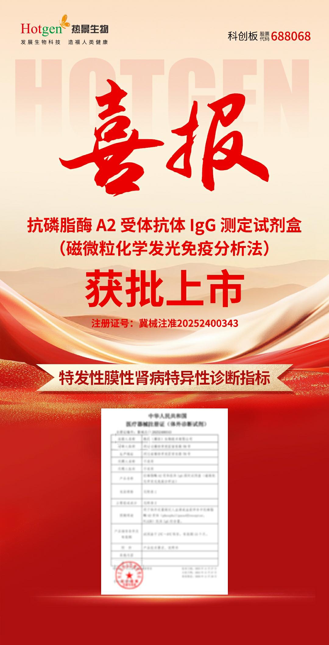 近期北京熱景生物憑借深厚的研發(fā)積淀與技術(shù)創(chuàng)新實(shí)力,成功斬獲一項(xiàng)新的醫(yī)療器械注冊(cè)證 ——抗磷脂酶 A2 受體抗體 IgG 測(cè)定試劑盒(磁微?;瘜W(xué)發(fā)光免疫分析法)正式通過(guò)河北省藥品監(jiān)督管理局批準(zhǔn)!這一突破豐富了熱景生物在腎病診斷領(lǐng)域的產(chǎn)品矩陣,為臨床診療提供更為高效的檢測(cè)方案,進(jìn)一步引領(lǐng)膜性腎病精準(zhǔn)檢驗(yàn)。