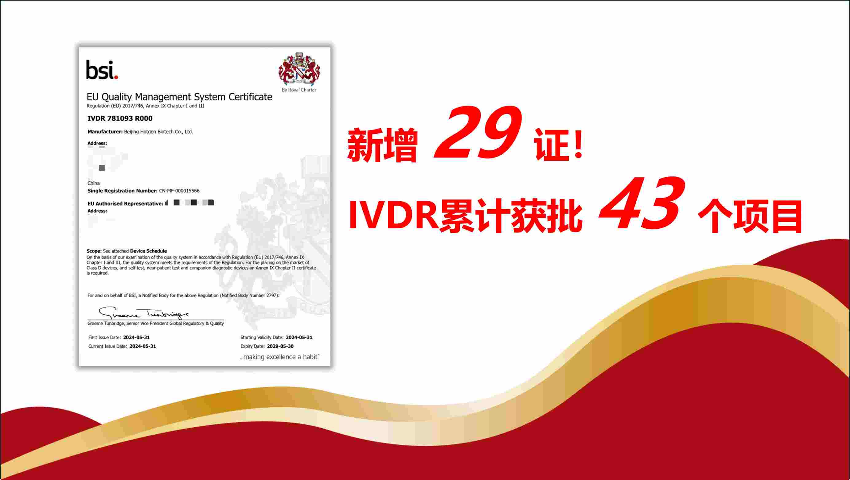 近日,熱景生物在歐盟體外診斷醫(yī)療器械法規(guī)(IVDR)下新增29款診斷產(chǎn)品的CE認(rèn)證。該CEIVDR證書(shū)由歐洲最有聲望的認(rèn)證機(jī)構(gòu)之一英國(guó)標(biāo)準(zhǔn)協(xié)會(huì)(BSI)頒發(fā)。新批準(zhǔn)的29種診斷試劑覆蓋了熱景生物旗下全...