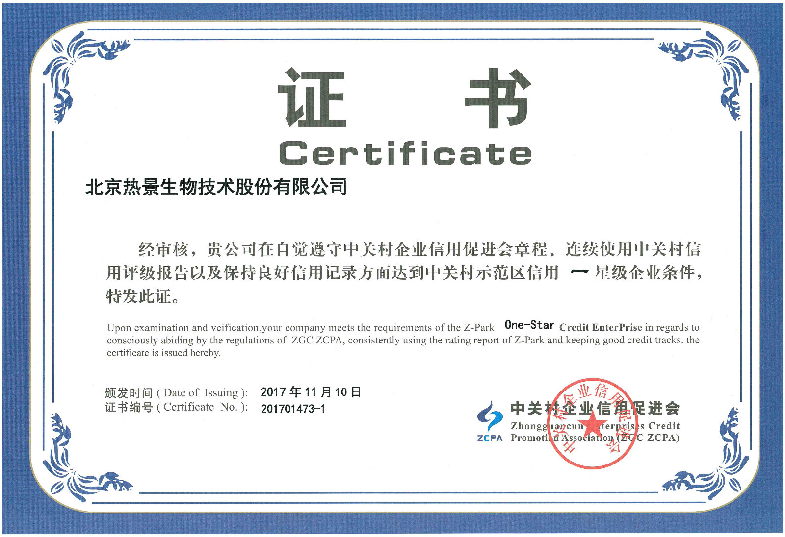 中關(guān)村信用促進(jìn)會信用星級評定證書一星級